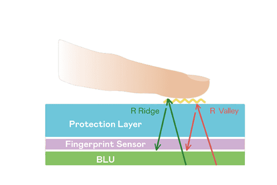 TFT 指纹扫描感测技术利用薄膜电晶体 (TFT) 当作光感测元件,,,藉由非晶硅 (a-Si) 与低温多晶硅(LTPS)既有光电转换特性对不同波段光源进行吸收,,,,使感测 IC 读取阵列感测元件的光漏电差异,,转换成数位灰阶影像。。。